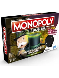 Monopoly Voice Banking beeindruckt mit dem interaktiven Banking-Zylinder und dessen Lichtern und Sounds; Der Zylinder wickelt per Sprachsteuerung den kompletten Geldverkehr ab und Mr. Monopoly wird durch seine interaktiven Antworten lebendig. Er weiß stets die Kontostände aller Spieler, so dass sich keiner um Geldzahlungen oder Karten kümmern muss. Er antwortet auf Fragen und reagiert auf Befehle; sagen Sie zum Beispiel „Schlossallee kaufen”, führt er den Kauf selbstständig aus und das Spiel geht weiter. Auch bei Monopoly Voice Banking ist das Ziel, um den Spielplan zu ziehen und am Spielende der Spieler mit dem meisten Geld und dem höchsten Grundstückswert zu sein.
