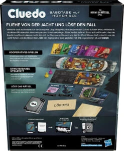 „Cluedo Sabotage auf hoher See“ kombiniert die Intrigen und Charaktere aus dem klassischen Detektivspiel mit einem fesselnden Escape-Room-Erlebnis. Sie ziehen Ihre Figuren über das immer größer werdende Spielbrett, während Sie die Jacht erkunden, Karten ziehen, Rätsel lösen, neue Räume enthüllen und Beweise aufdecken. Nach der Flucht von der Jacht überprüfen Sie Ihre Beweise und gewinnen mit einer richtigen Anschuldigung.