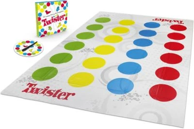 Mit dem coolen Gesellschaftsspiel Twister von Hasbro wird jede Party ein Hit! Die lustigen Verrenkungen sorgen bei Spielenden und Zuschauenden für Begeisterung und manchmal kann es richtig anstrengend werden! Eine Person dreht als „Schiri“ die Scheibe, die bestimmt, auf welche bunten Punkte die Spielenden ihre Hände und Füße stellen. Dabei kommen die Spieler*innen in witzige Positionen, bei denen sie manchmal sogar umfallen. Wer als letztes steht, gewinnt!