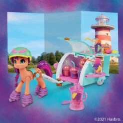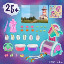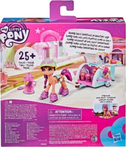Mit der enthaltenen Storyszene kann Smoothie Shop Sunny Starscout auf jede Menge spannende Abenteuer geschickt werden. Das Set enthält eine 7,5 cm große, orangefarbene Sunny Starscout Ponyfigur mit geformten pinken Haaren. Weiterhin befinden sich im Set über 25 Teile, inklusive toller Accessoires, mit denen die Kinder das Pony anpassen können. Aus der Spielmasse in den 2 enthaltenen Dosen können sogar Spiel-Smoothies gemixt werden Wird die Masse in das Mixer-Accessoire gefüllt, lässt sie sich darin richtig drehen und es entsteht eine bunte Leckerei. Wird die Masse dann in die Becher gefüllt und mit den lustigen Früchten garniert, entsteht ein leckerer Spiel-Smoothie. Dank der enthaltenen Storyszene können Kinder so tun, als ob Sunny wie im Film mit ihrem Wagen Smoothies verkauft.