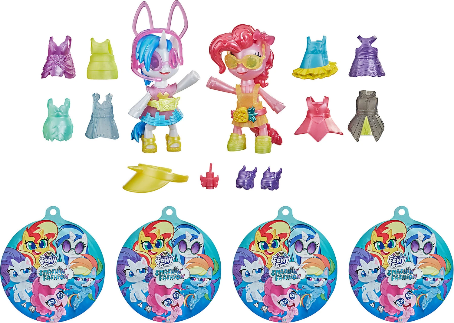 Diese kleinen Ponys sind absolut poppig! Das Smashin‘ Fashion-Set enthält bewegliche Ponyfiguren von Pinkie Pie und DJ Pon-3, die für wilde und verrückte Abenteuer bereit sind. Lege die 4 mitgelieferten Smashin‘ Packs auf eine ebene Fläche und zerschmettere sie mit deiner Hand, um zu sehen, wie sie sich ausdehnen, dann POP! Jede Tasche öffnet sich und enthüllt ein von vielen Charakteren inspiriertes Modeaccessoire und einen Freundschaftsballon.