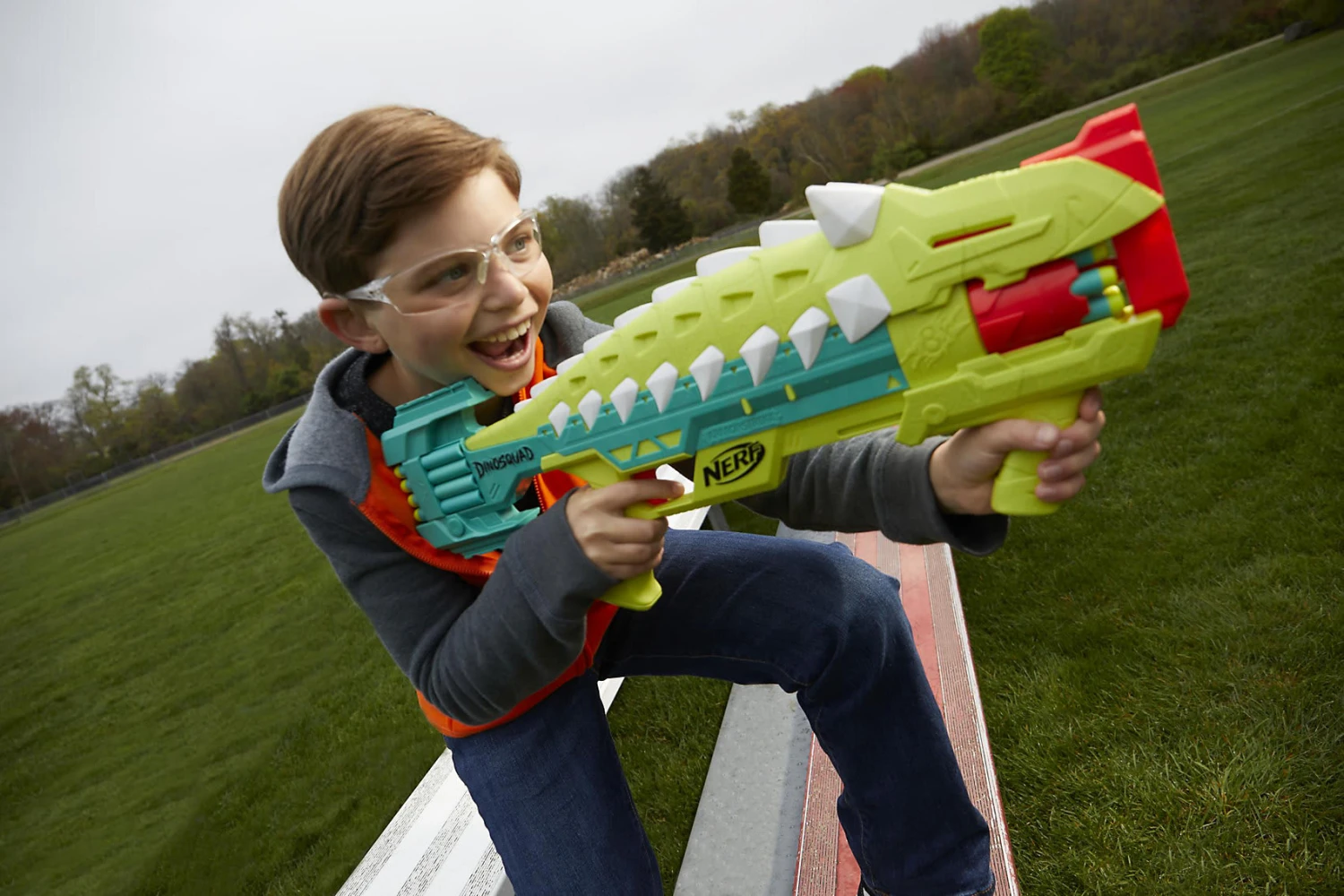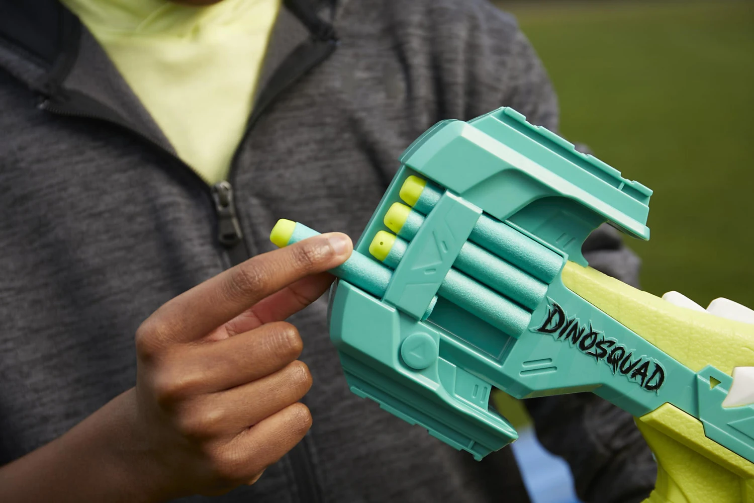 Als Mitglied der Elitetruppe DinoSquad verbünden sich Nerf Fans mit legendären Sauriern. Hier kann die außergewöhnliche Kraft der großartigsten Dinosaurier entfesselt werden, um sich in actionreiche Abenteuer zu stürzen. Mit dem Nerf DinoSquad Armorstrike Blaster von Hasbro ist saurierstarke Action angesagt! Er zeigt coole Dinosaurier-Details und kommt im Look eines Ankylosaurus. Hier können acht Darts in Folge aus der 8-Dart-Rotationstrommel abgefeuert werden, um zu zeigen, dass man jede Menge Dino-Power hat. Einfach den Pump-Griff nach hinten und nach vorne bewegen, um den Blaster vorzubereiten. Der zweite Griff dient zur Stabilisierung beim Abfeuern. Der Blaster kommt mit 16 Nerf Elite Darts – acht Darts, um die Trommel zu bestücken und acht Darts, die zum schnellen Nachladen direkt am Blaster aufbewahrt werden können. Um einen Dart abzufeuern, wird die Trommel bestückt, der Griff bewegt und der Abzug gedrückt. Ein Augenschutz wird empfohlen (nicht enthalten).