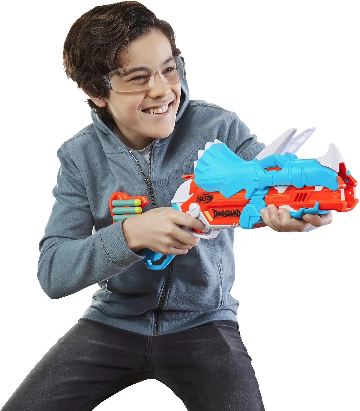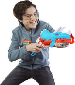 Der Hasbro NERF TRICERABLAST zeigt sich im coolen Dinosaurierlook und lässt sich leicht bedienen. Drei Darts können gleichzeitig geladen und abgefeuert werden. Der Blaster verfügt zudem über eine integrierte Dart-Aufbewahrung für zwölf Darts – so kann immer schnell nachgeladen werden.