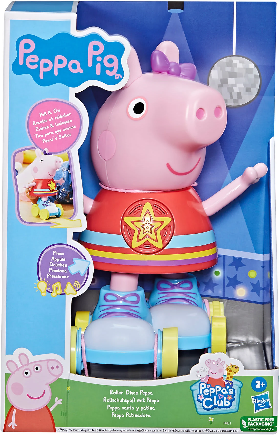 Auf geht es in die Rollschuhdisco mit Peppa Pig. Die kleine Schweinedame ist wohl allen Kids aus der Sendung „Peppa Wutz“ bekannt, wo sie seit Jahren lustige und spannende Abenteuer mit ihrer Familie erlebt. In der Version von Hasbro zeigt Peppa, was sie so alles auf Rollschuhen kann. Die liebevoll gestaltete Puppe begeistert mit interaktiven Tools, spielt Lichter und Geräusche und sogar die passende Musik ab. Sie spricht auf Englisch und durch Zurückziehen fährt sie ganz von alleine. Kinder können gemeinsam mit ihrem Idol das Rollschuhfahren üben und die vielen interessanten Tools ausprobieren.