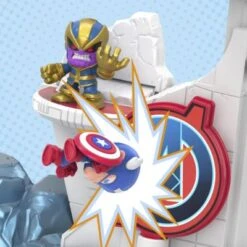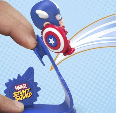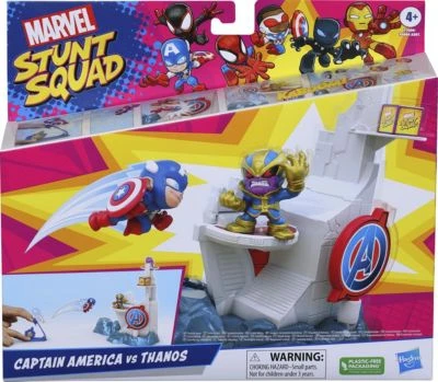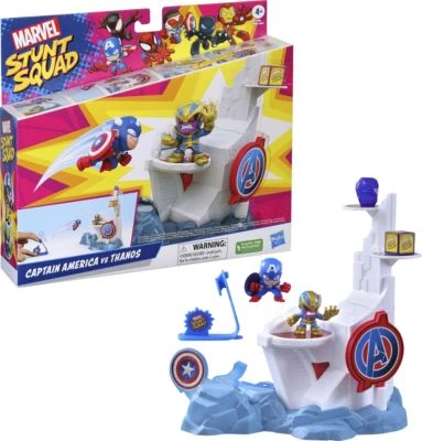 Hier kommen die Schurken und Helden als tolles Spielvergnügen in die Kinderzimmer. Mit dem Marvel Stunt Squad Spieleset können kleine Fans spannende Battles zwischen Gut und Böse nachspielen oder neu erfinden. Dieses Marvel „Helden gegen Schurken“ Spielset enthält eine Captain America und eine Thanos Spielfigur, einen Starter und eine Basis als Ziel, um den Schurken zu besiegen. Die Basis lässt sich umbauen – so kann der Schurke auf unterschiedliche Arten bezwungen werden. Für actiongeladene Spielmomente in der Kinderzimmer-Welt ist gesorgt.